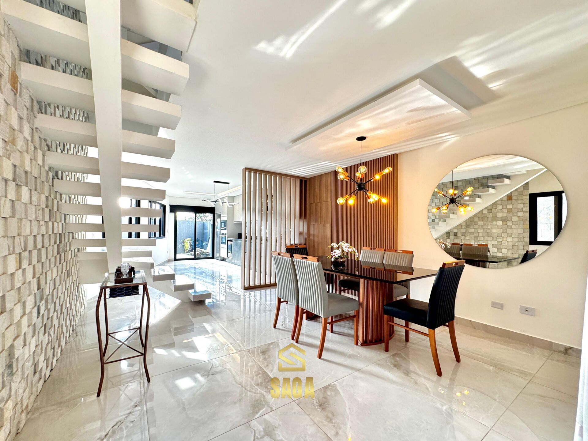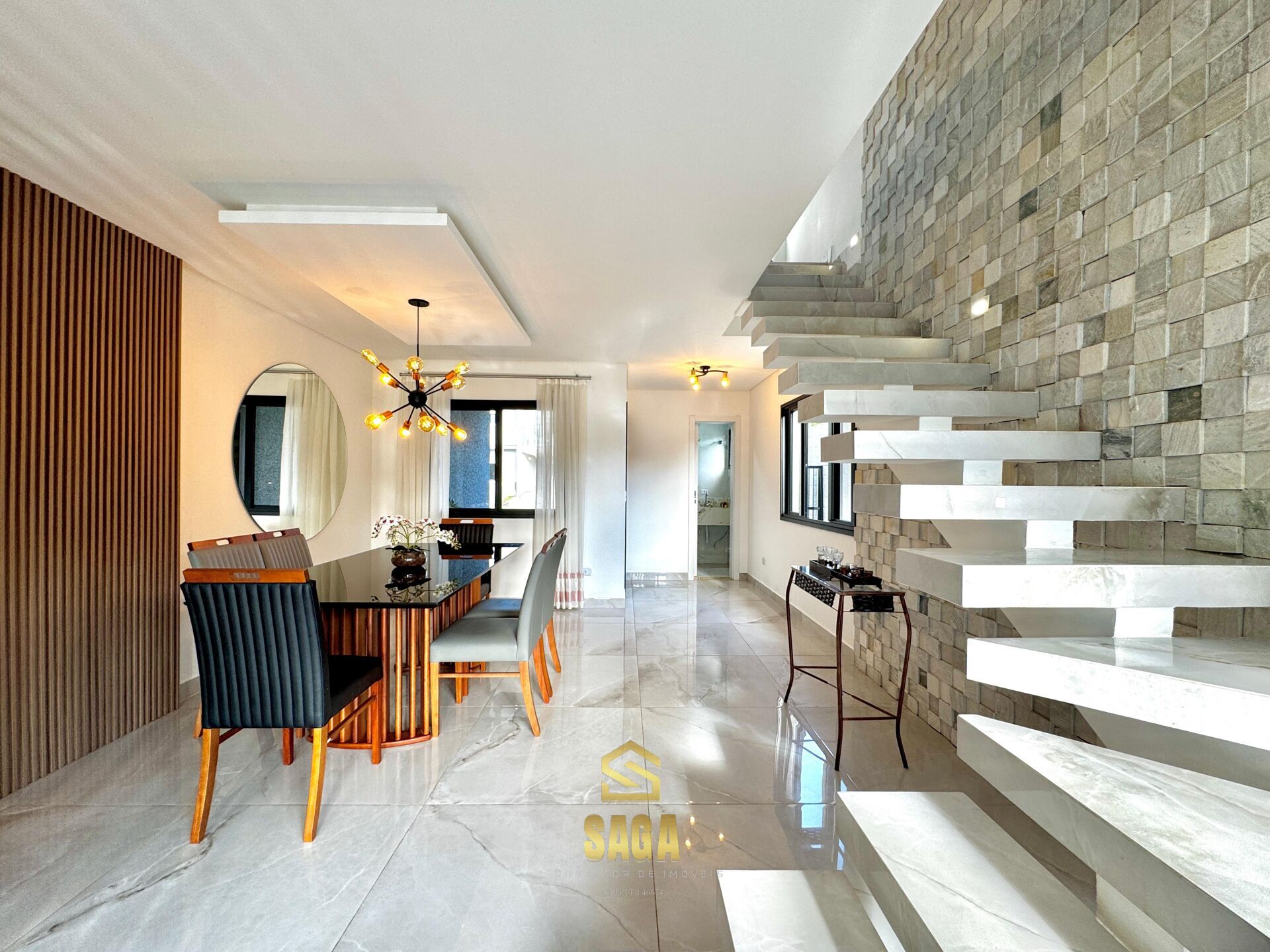 • No 1 ° pavimento: sala de jantar, cozinha com móveis planejados, fogão cooktop, forno, microondas, lavabo, área de serviço e espaço de terreno;